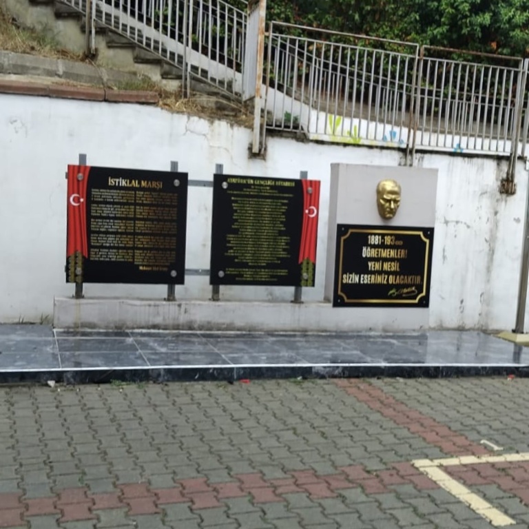 Okulumuzun tören alanında bulunan Atatürk büstü ile Gençliğe Hitabe ve İstiklâl Marşı tabelaları yenilenmiştir.